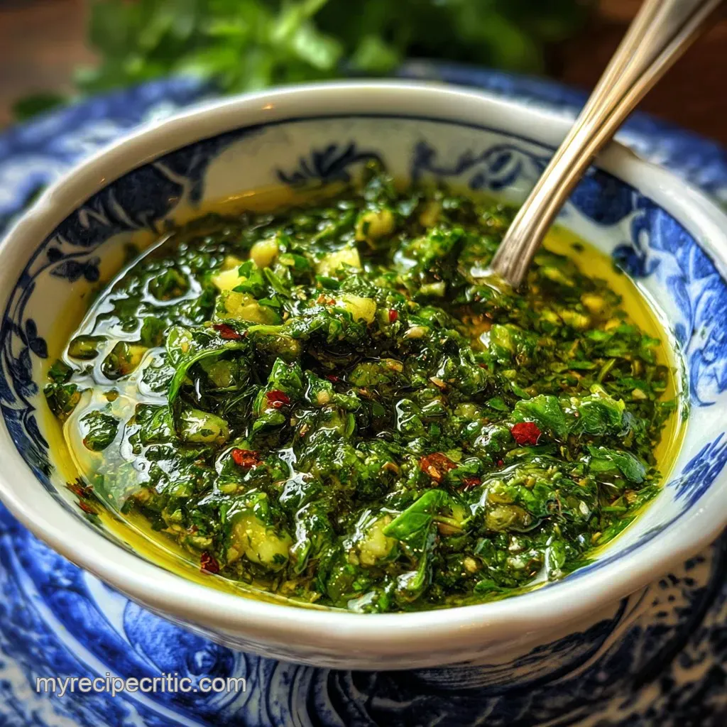 For a restaurant quality look, use a small spoon to drizzle a few extra drops of plain olive oil around the edges of the chimichurri. This creates a "halo" effect that makes the sauce look even more lush and velvety.