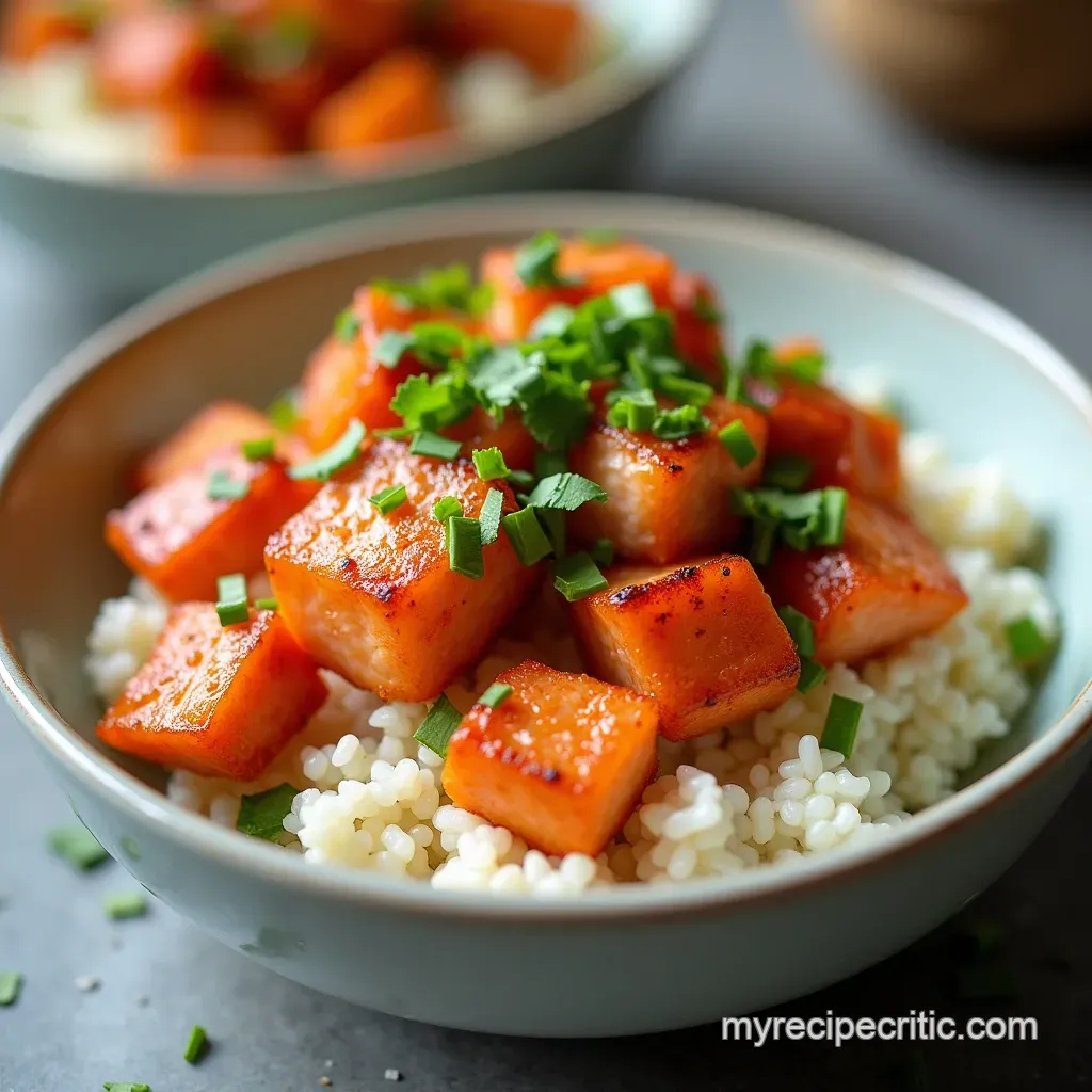 To build the bowl, first scoop a generous serving of the warm, creamy coconut rice into the base of each dish. Next, artfully arrange a portion of the sauced salmon bites over the rice.