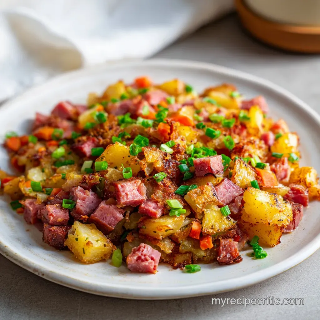 Serve hot, usually topped with a fried or poached egg. The runny yolk acts as a natural sauce that enriches the salty, crispy hash perfectly. A dash of vinegar based hot sauce cuts through the richness beautifully.